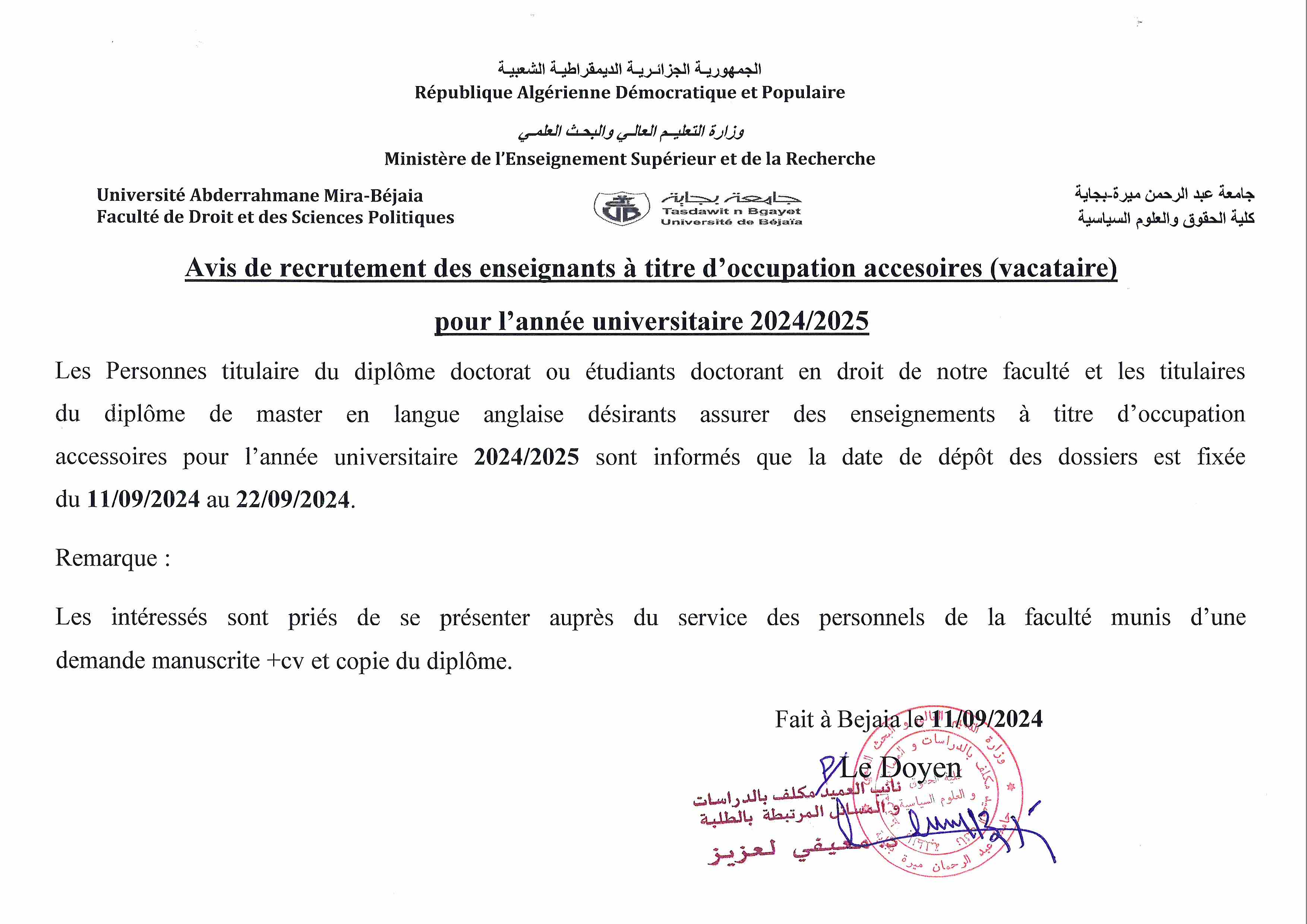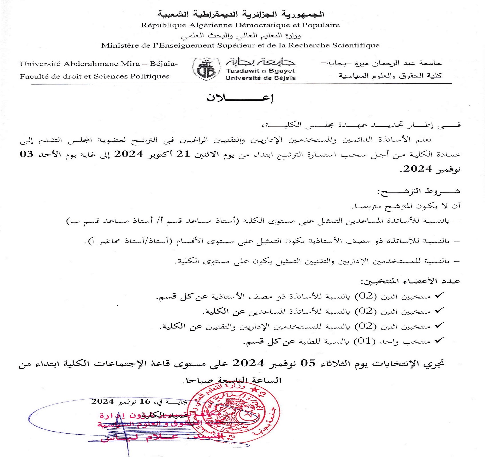 نعلم اساتذة كلية الحقوق والعلوم السياسية أعضاء قائمة الهيئة الناخبة على مستوى الندوة الجهوية للجامعات-الوسط، المعنيين بانتخاب اساتذة القانون الدستوري- أعضاء في المحكمة الدستورية بما يلي: