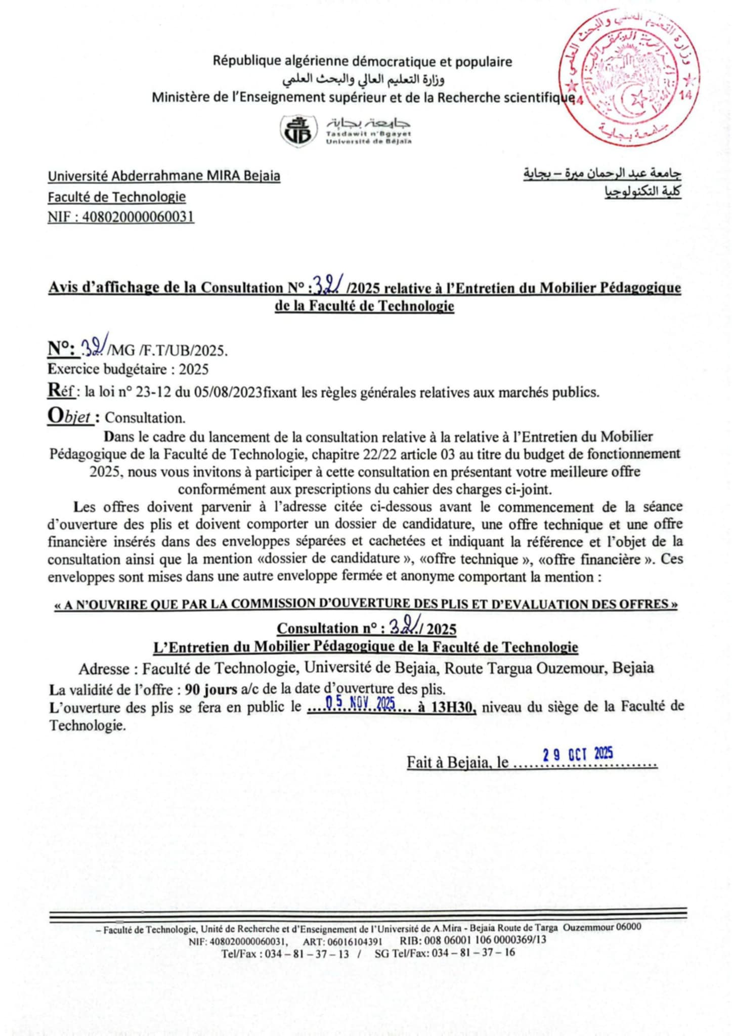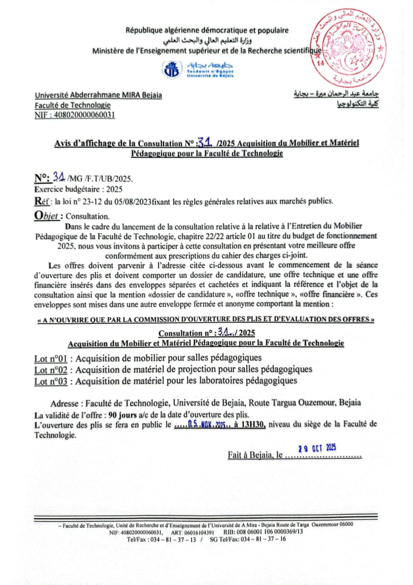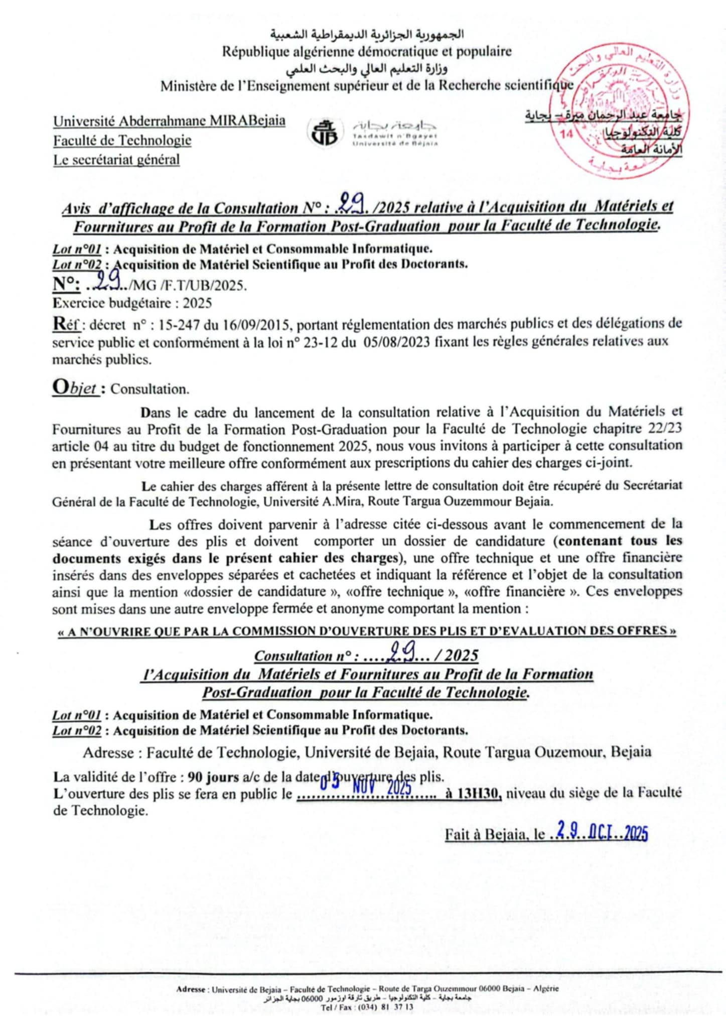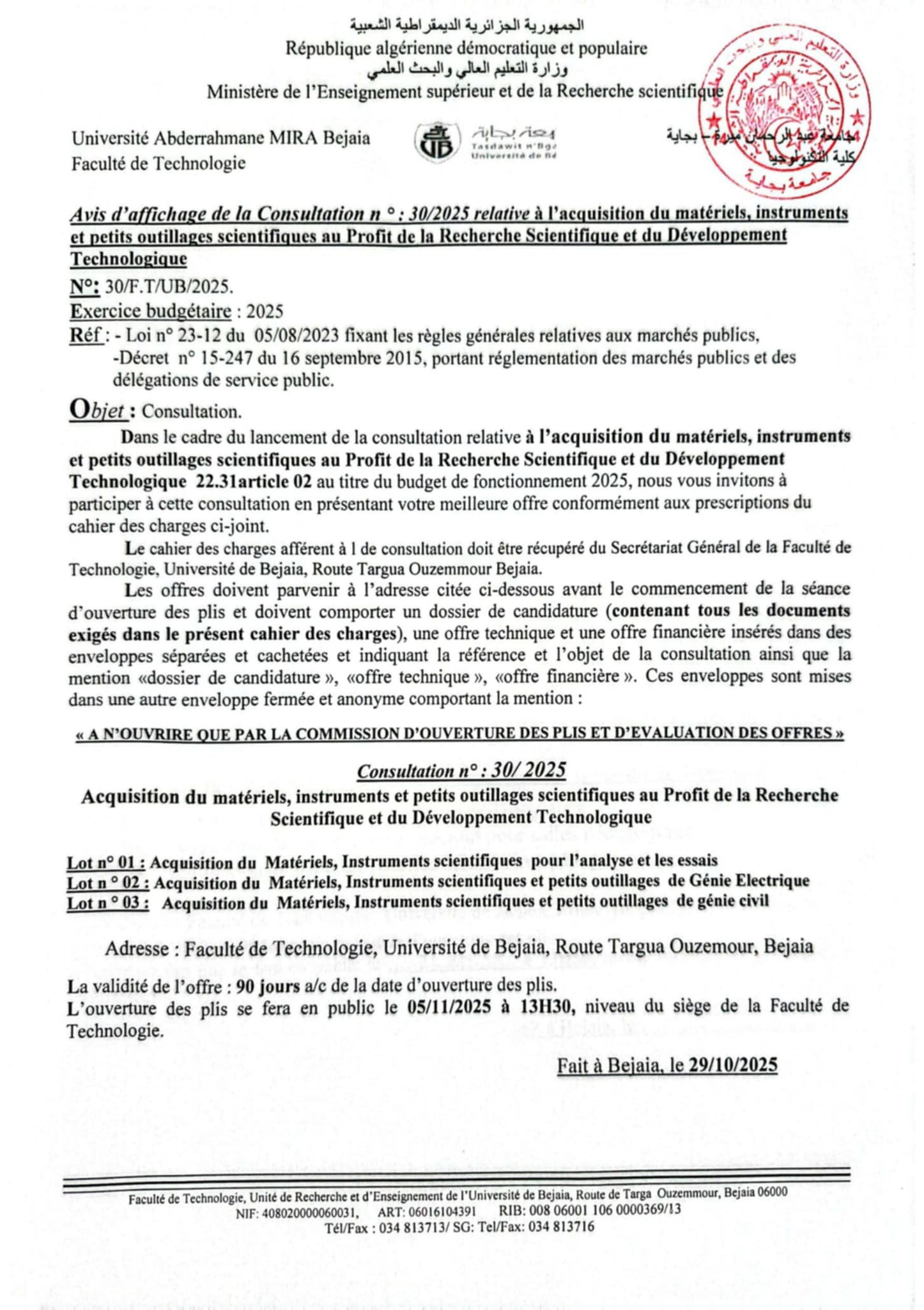 Consultation N° 29/2025 Acquisition du materiels et fournitures au profit de la formation PosGraduation pour la faculté de technologie . Consultation N° 30/2025 Acquisition du materiels , instruments et petits outillages scientifiques au profit de la recherche scientifique et du développement technologique. Consultation N° 31/2025 Acquisition du mobilier et materiels pédagogique pour la faculté de technologie. Consultation N° 32/2025 Entretien du mobilier pédagogique de la faculté Consultation N° 27 et 28/2025 Achat du materiels , instruments et petits outillages scientifiques au profit de la recherche scientifique et du développement technologique Consultation N° 25 et 26/2025 :Achat de papetrie et acquisition du materiel informatique pour la faculté de Technologie. . Consultation N° 24/2025 :Travaux d'entretien et réparation des locaux Administratifs et pédagogiques de la faculté. Consultation N° 21-22-23/2025 : acquisition du matériels et fournitures au profit de la formation Post-Graduation pour la faculté. Consultation N° 21-2025 : Travaux d'entretien et réparation des locaux Administratifs et pédagogiques de la faculté. Consultation N° 22-2025 :Acquisition des ouvrages de bibliothèque pour la faculté. Consultation N° 23-2025 :Achat des produits chimiques pour département de génie des procédés pour la faculté de Technologie. Consultation N°20/2025 : Acquisition du mobilier et materiels , instruments et petits outillages scientifiques au profit de la recherche scientifique et du développement technologique. Consultation N°16/2025 : La maintenance des équipements scientifiques , des photocopieuses et des imprimantes au profit de la recherche scientifique et du développement technologique. Consultation N°15 -17- et 18/2025 : consultation n15: relative à l'acquisition de matériel et du consommable Informatiques au profit de la recherche scientifique et du développement technologique. consultation n17:relative à l'achat des produits chimiques pour département de génie des procédés pour la faculté de Technologie. consultation n18:relative à l'achat d'outils et consommables de laboratoires et d'ateliers d'enseignement et de recherche de la Faculté de Technologie. Consultation N°14 /2025 Acquisition des fournitures y compris composants électroniques, mécaniques et audio-visuels et Accessoires et des besoins de laboratoires au profits de la recherche et du Développement Technologique Consultation N°10 et N°11 /2025