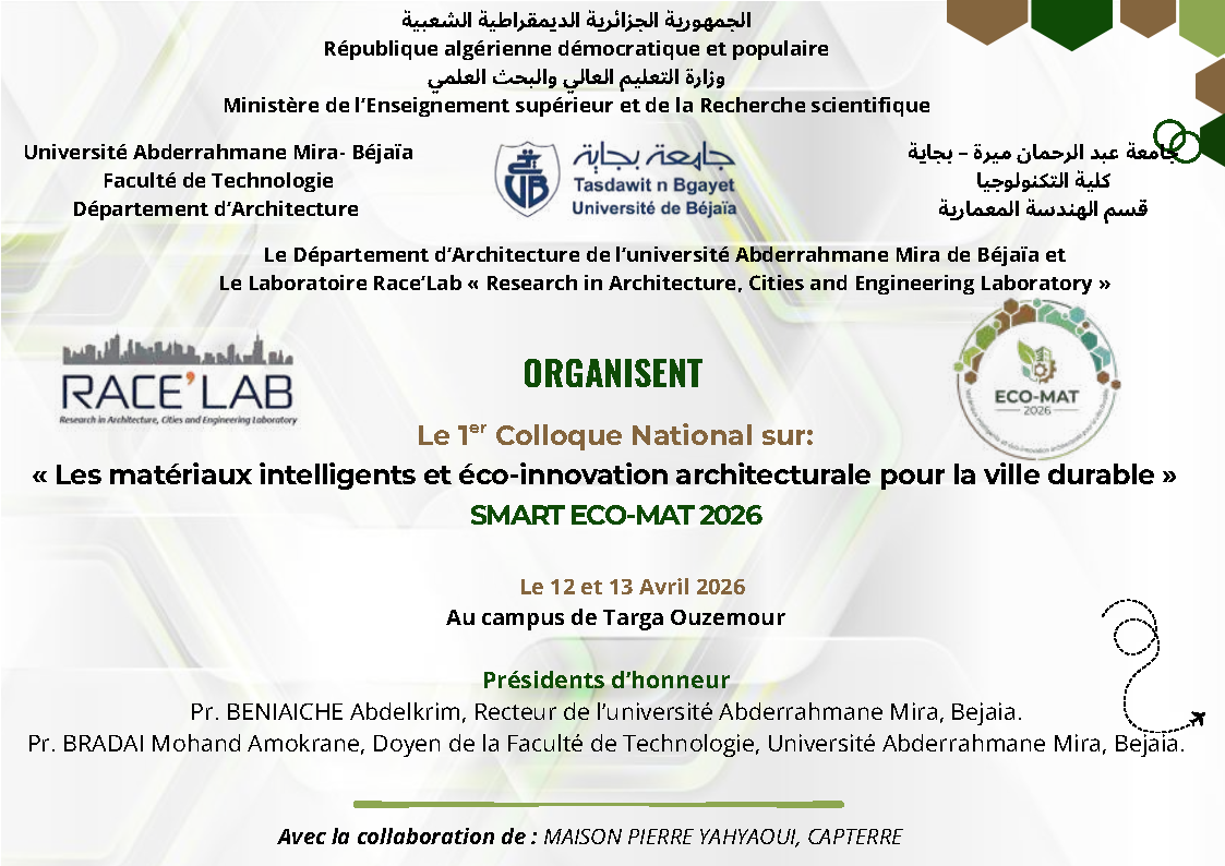 organisé par :Le Département d’Architecture de l’université Abderrahmane Mira de Béjaïa et Le Laboratoire Race’Lab « Research in Architecture, Cities and Engineering Laboratory »