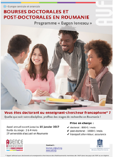 Le programme de bourses "Eugen Ionescu" permet aux doctorants et aux enseignants-chercheurs des pays membres ou observateurs de l’OIF et de l'Algérie, issus des établissements membres de l’AUF, de bénéficier d’un stage de recherche de 3 à 4 mois en Roumanie, dans une des 27 universités partenaires.