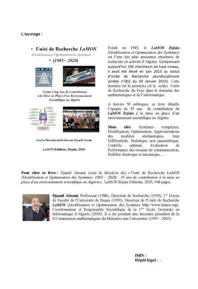 A travers une cinquantaine de rubriques, ce livre synthèse détaille l’épopée de 35 ans de contribution du LaMOS à la mise en place d’un environnement scientifique en Algérie.