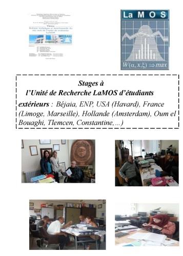 Le LaMOS (Modélisation et Optimisation des Systèmes) est l’une des plus anciennes structures de recherche en activité d’Algérie. Comprenant aujourd’hui 156 chercheurs de haut niveau, il a été élevé au statut d’Unité de Recherche pluridisciplinaire (arrête n°002 du 04 Janvier 2014). Le LaMOS est ainsi devenu en juin 2013 la première Unité de Recherche du pays dans les domaines des Mathématiques, de l’Informatique et de la Technologie.