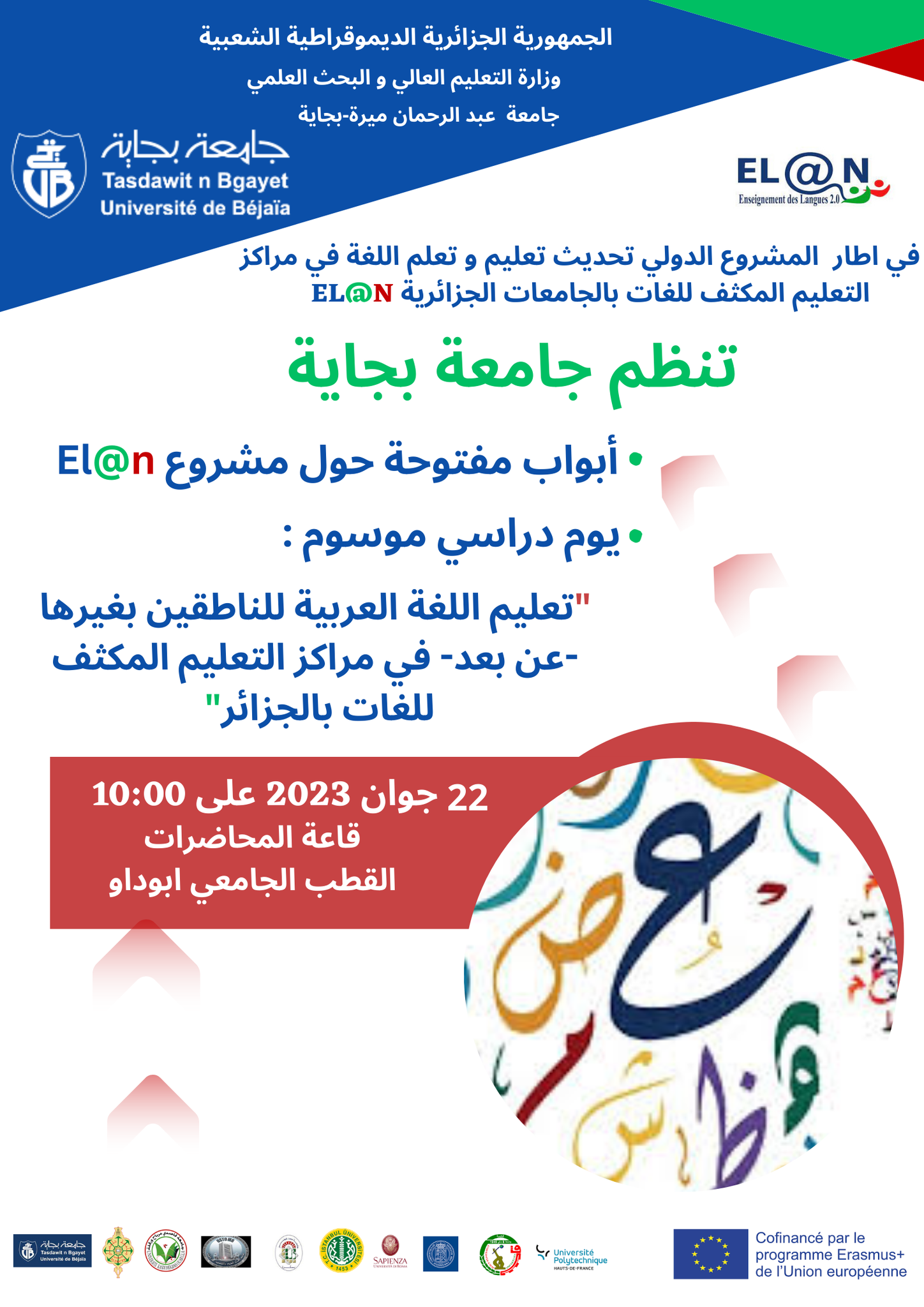 Célébration des Erasmus Days Activité: Réunion zoom planifiée sur « Un premier aperçu en avant-première du contenu pédagogique de la plate forme EL@N » Date : 17 octobre 2020. Lieu : la réunion s'est tenue en ligne Animateur : Dr LALILECHE Nadir, Coordinateur du projet à l’Université de Béjaïa Toutes les activités réalisées durant ces trois jours sont retransmises sur : • le site de l’Université de Béjaia : http://webtv.univ-bejaia.dz/index.php/page/2/ • les Pages Face book : https://www.facebook.com/vr.relex.univbejaia https://www.facebook.com/Webtv.universite.de.Bejaia https://www.facebook.com/Universite.A.M.Bejaia/